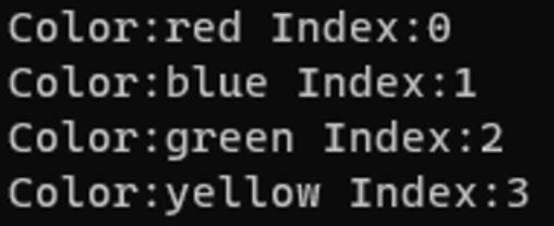 string[] colorArray = { "red", "blue", "green", "yellow" }; foreach(var item in colorArray.Select((value, index) => (value, index))) { var color = item.value; var index = item.index; Console.WriteLine(color, index); }실행 결과