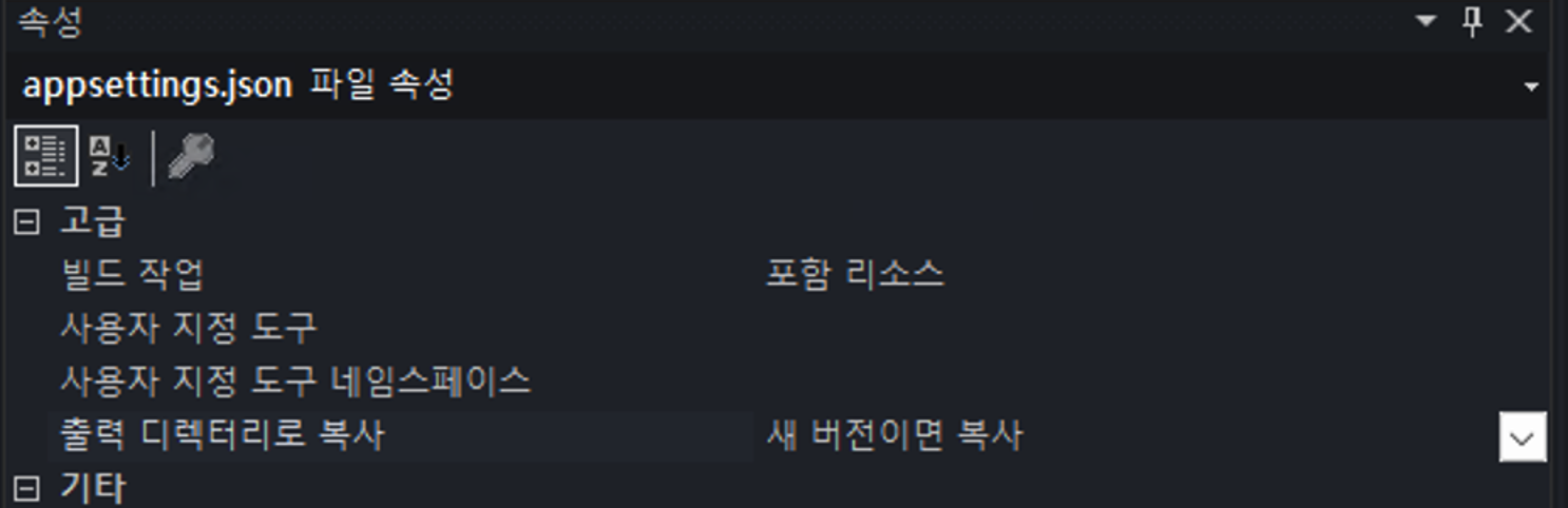 json 파일을 우클릭 하고 속성 탭을 클릭.