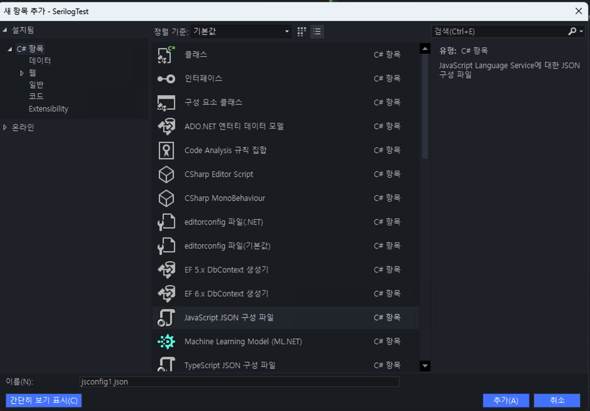 일단, 리소스 새 항목 추가에서 json 파일을 생성해줍니다.