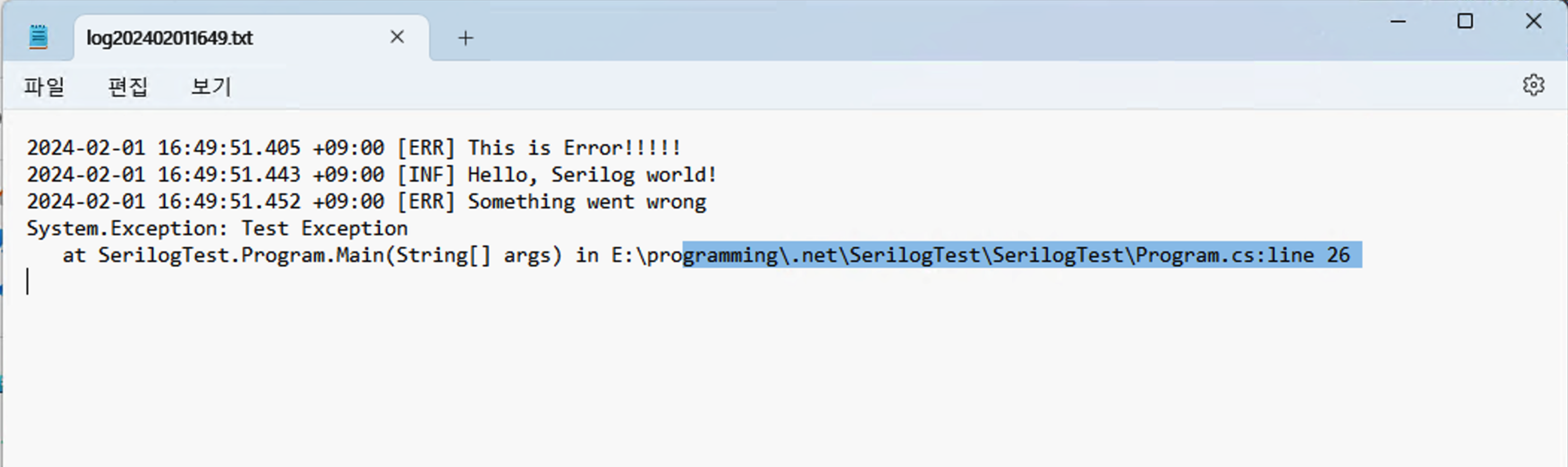 using Microsoft.Extensions.Configuration; using Serilog; namespace SerilogTest { internal class Program { static async Task Main(string[] args) { Console.WriteLine("Hello, World!"); var configuration = new ConfigurationBuilder() .SetBasePath(Directory.GetCurrentDirectory()) .AddJsonFile("appsettings.json") .Build(); Log.Logger = new LoggerConfiguration() .ReadFrom.Configuration(configuration.GetSection("Log")) .CreateLogger(); try { Log.Error("This is Error!!!!!"); Log.Information("Hello, Serilog world!"); throw new Exception("Test Exception"); } catch (Exception ex) { Log.Error(ex, "Something went wrong"); } finally { await Log.CloseAndFlushAsync(); } } } }configuration 에서 appsettings.json 의 내용을 읽어오고, GetSection 메서드로 "Log" 부분만 따로 가져옵니다.