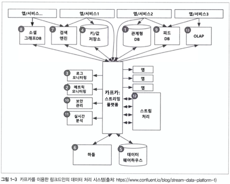 Kafka는 비즈니스 소셜 네트워크 서비스 플랫폼인 LinkedIn 에서 설계한 시스템으로, 어플리케이션이 늘어남에 따라 발생하는 기존 데이터 시스템의 문제점을 극복하기 위해 등장한 메시징 시스템입니다.