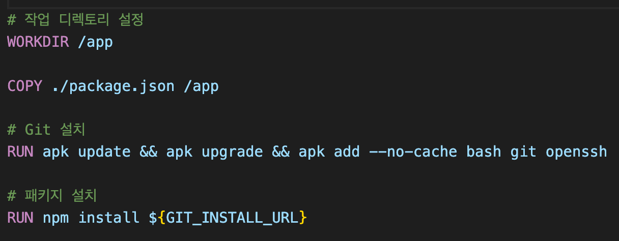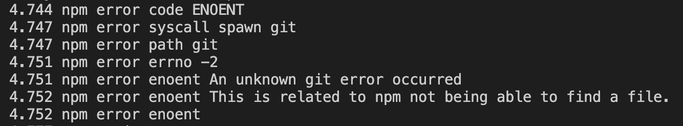 RUN npm install 하기 전에, Git 설치 명령어 입력 후 다시 빌드해준다.