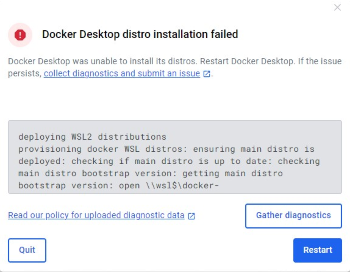 산업 현장 PC 에 설치 후, 직원분께서 Network 설정이 바뀐 뒤에 Docker Error 가 발생한다고 하여 확인해보니 Docker Desktop distro installation failed 알람창이 나타나면서 Docker-Desktop 가 실행이 안되었다.