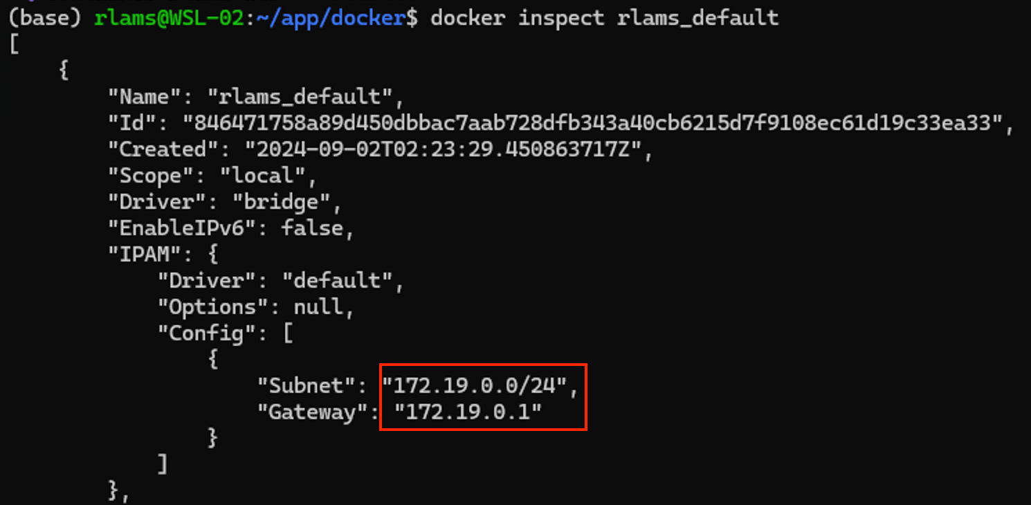 # yaml 파일 포맷의 버전을 나타낸다. Docker-Compose 버전 마다 사용하는 yaml 포맷이 다르다. version: "3.8" # Project Name 설정 name: rlams services: # InfluxDB influxdb: ... # MongoDB mongodb: ... # Mosquitto mosquitto: ... # Telegraf telegraf: ... # Server was-server: ... # Web web: ... networks: default: driver: bridge ipam: driver: default config: - subnet: 172.19.0.0/24 gateway: 172.19.0.1저는 Docker-Compose 를 작성하여 실행시켰으므로, 방법 2를 사용해서 고정 IP 를 주었습니다.