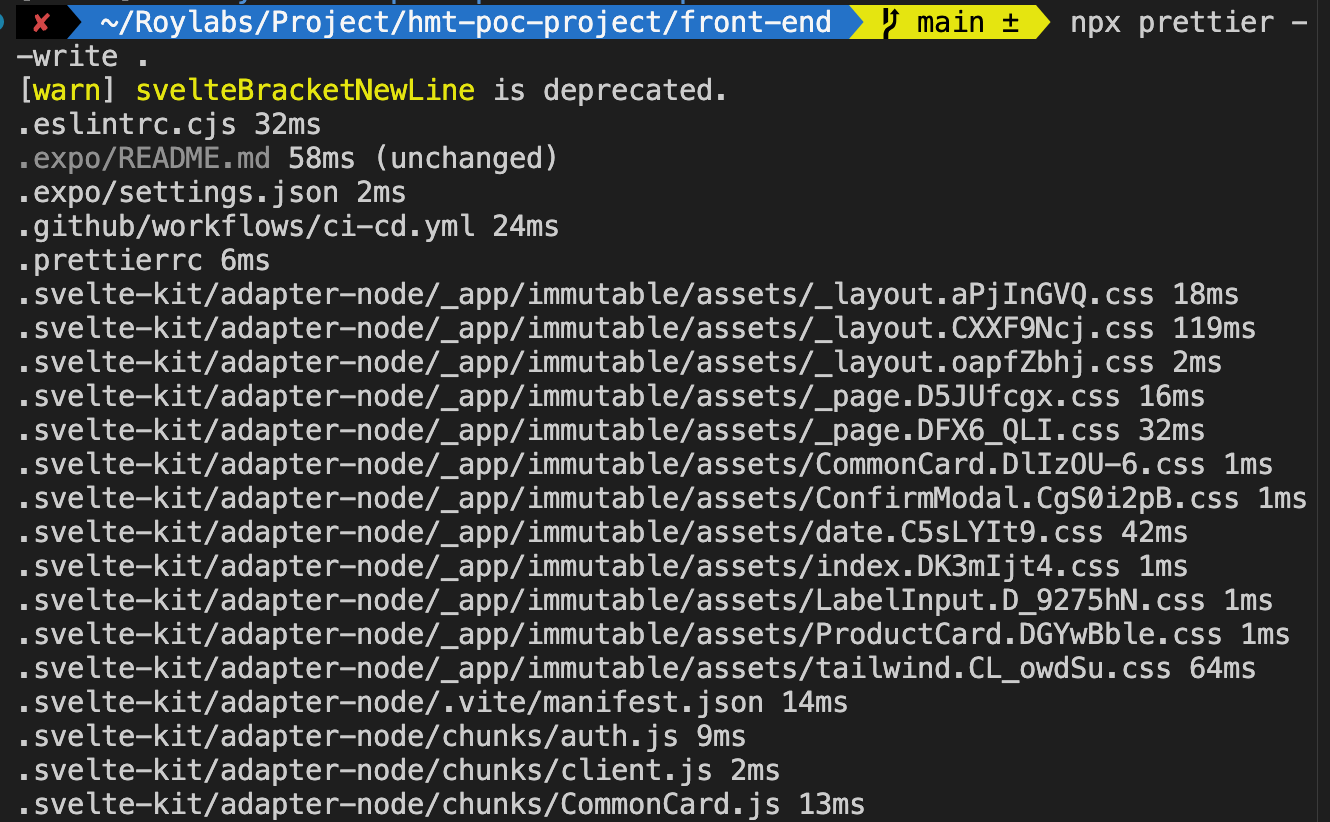 npx prettier --write .이 코드를 실행하니 아니나 다를까, 다음과 같이 에러가 발생했다.