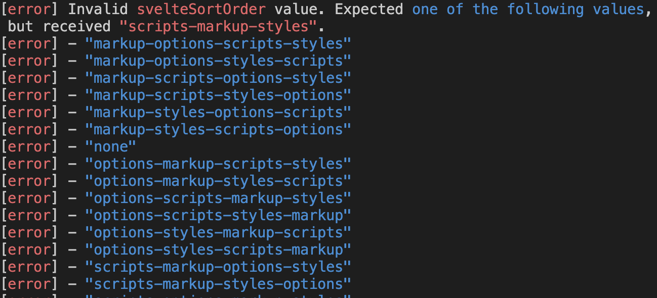 에러를 보니 svelteSortOrder 에러이다. prettirrc 파일에서 저 옵션을 건드려주자.